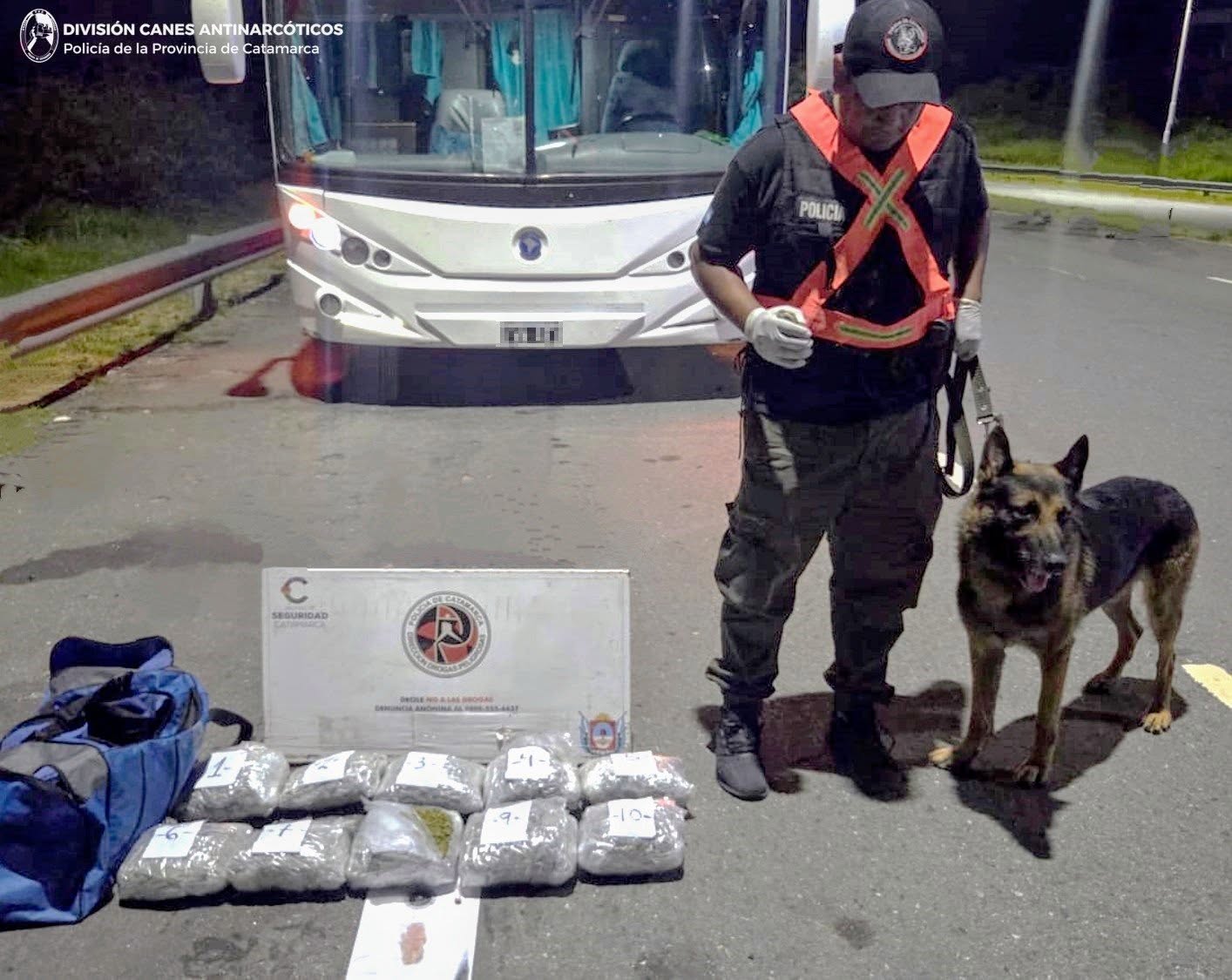El procedimiento se realizó en Valle Viejo, durante un control a un colectivo de larga distancia, con intervención de personal antinarcóticos y un can detector de estupefacientes.
