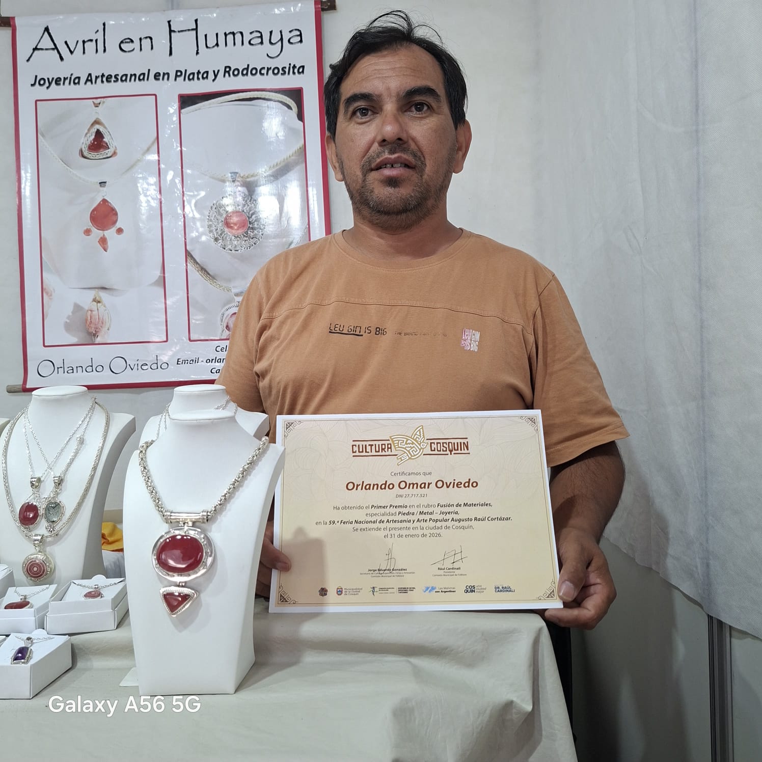 El orfebre catamarqueño recibió el primer premio en el rubro fusión de materiales por una pieza que combina rodocrosita con plata. “Es una alegría inmensa después de más de 15 años de trabajo que lleguen estos momentos en que todo lo que uno ha hecho para aprender, para capacitarse, de sus frutos”, valoró Oviedo