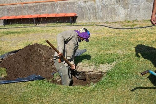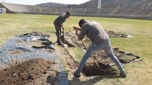 En paralelo, se sigue trabajando en optimizar la distribución del agua mientras se realiza la conexión de un pozo que será el abastecedor. En la cancha, se están cambiando y ampliando el sistema de aspersores para alcanzar con el riego todas las zonas con un igual caudal de agua para asegurar la recuperación y mantención de todo césped.
