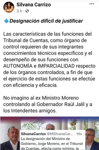 “Las características de las funciones del Tribunal de Cuentas, como órgano de control requieren de sus integrantes conocimientos técnicos específicos y el desempeño de sus funciones con AUTONOMÍA e IMPARCIALIDAD respecto de los órganos controlados, a fin de que el ejercicio de estas funciones se efectúe con eficiencia y eficacia. No imagino al ex Ministro Moreno controlando al Gobernador Raúl Jalil y a los Intendentes amigos”, disparó a través de las redes sociales.