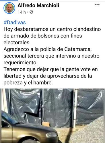 “Hoy desbaratamos un centro clandestino de armado de bolsones con fines electorales. Agradezco a la policía de Catamarca, seccional tercera que intervino a nuestro requerimiento. Tenemos que dejar que la gente vote en libertad y dejar de aprovecharse de la pobreza y el hambre”, publicó en su cuenta de facebook Marchiolli, acompañando las imágenes grabadas durante el procedimiento policial.
