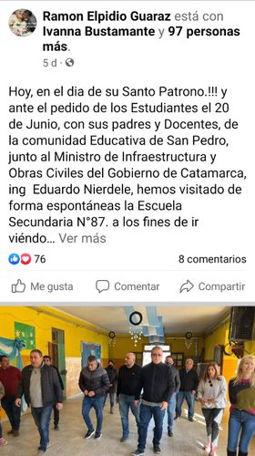 A través de sus redes sociales, el intendente Guaraz publicó las fotos del recorrido y escribió: “Ante el pedido de los Estudiantes el 20 de Junio, con sus padres y Docentes, de la comunidad Educativa de San Pedro, junto al Ministro de Infraestructura y Obras Civiles del Gobierno de Catamarca, ing Eduardo Nierdele, hemos visitado de forma espontánea la Escuela Secundaria N°87 a los fines de ir viendo lo requerido para dar formalidad y tratar de dar solución al mismo.!!!”.