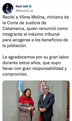 El Gobernador Raúl Jalil, recibió a la ministra de la Corte de Justicia Vilma Molina, quien renunció como integrante al máximo tribunal para acogerse a los beneficios de la jubilación.