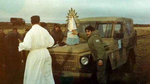 El padre Reinaldo Oviedo, capellán de Gendarmería Nacional en Catamarca, comentó que “esta imagen de la Virgen de Luján fue traída desde las Islas Malvinas hace poco tiempo; es la que estuvo con los soldados en el tiempo de la guerra. Mons. Santiago Olivera determinó que recorra los lugares de Gendarmería, el Ejército y la Marina, que pertenecen al Obispado Castrense, porque consideró que haría mucho bien. De esta manera llegó a Catamarca. La busqué en Concepción, Tucumán, y el lunes la entregamos al capellán de La Rioja en la localidad de Bazán, luego de la celebración en la sede de la Agrupación VIII”.