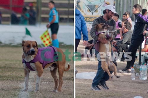 El lunes pasado, en Cata News publicamos dos fotos de una simpática situación que ocurrió durante el partido que disputaron Independiente y Chacarita, en el estadio Malvinas Argentinas. Las imágenes mostraban como un perrito vestido con su remerita color violeta había ingresado al campo de juego y, ante su decisión de quedarse acostado en la cancha, tuvo que ser cargado en brazos y retirado afuera del cercado perimetral.